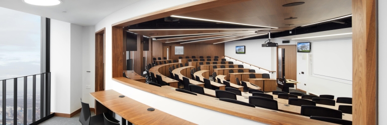 ● Lecture theatres and Seminar Suites: There is a large Seminar Suite and two state-of-the-art lecture theatres on the 38th floor; both are Harvard-style, with seats in an intimate semi-circular and tiered format. This shape ensures that all students are close to the lecturer allowing for a more immersive educational experience, as well as creating a more informal environment encouraging discussion. On Level 50 we have a larger flat space lecture theatre and a Harvard-Style Lecture Theatre as well as a Seminar Suite.
