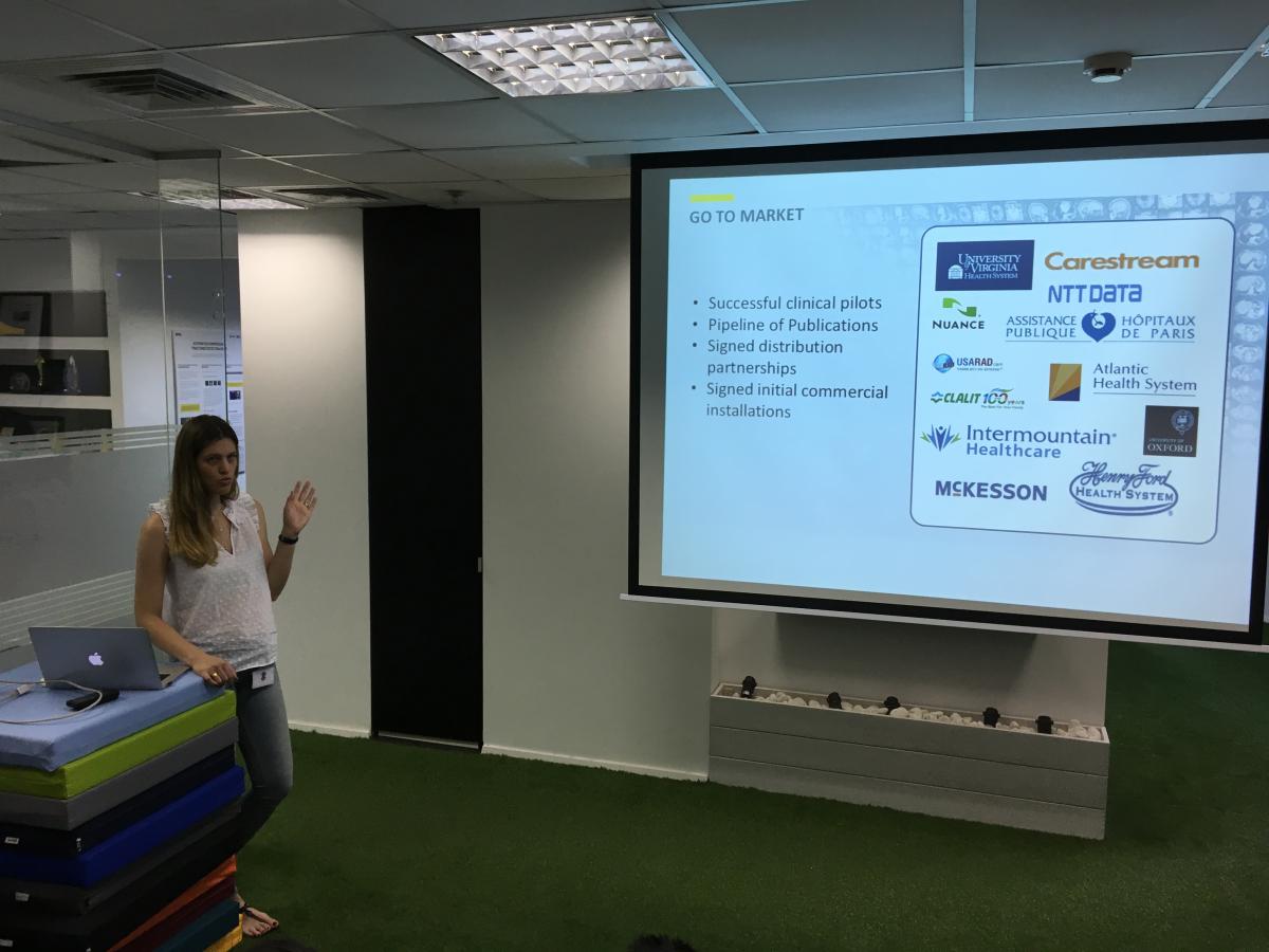 Our Tel Aviv tech exploration continued at Zebra medical vision, where Tom Goldberg Abramovic gave us an overview of the products Zebra are working on. They have developed algorithms which with machine vision scan medical images for specific medical conditions. Where a doctor would look at an MRI to determine a fracture, Zebra’s technology goes further and can spot early signs of diabetes and fatty liver, among others. It was interesting to hear their vision on how the healthcare and healthcare market is developing.