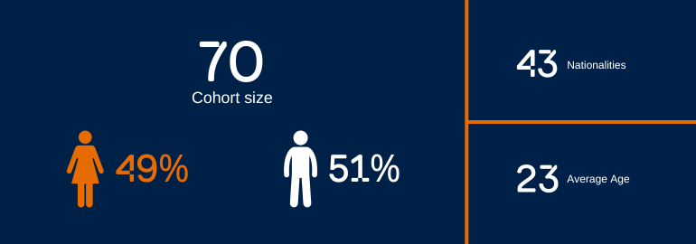 We aim to enrol a diverse global cohort of 70 students for the 2025–26 academic year. As this is a new programme launching in 2025, student data will begin with the first intake. However, the existing MSc Finance programme provides a useful benchmark for the type of cohort we expect to attract.