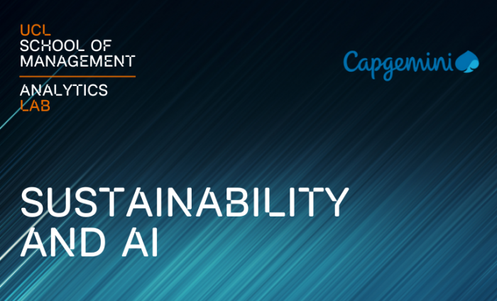 A new report from UCL students and consultancy firm Capgemini argues that while the use of AI can enable and accelerate the implementation of sustainability within organisations, a rigorous and comprehensive transformation is required to enable both AI and sustainability to work together hand in hand. Carried out at the UCL School of Management’s Analytics Lab, the report also explores the relationship between sustainability and AI, as well as the challenges of AI transformation and implementing AI as part of the sustainability journey.