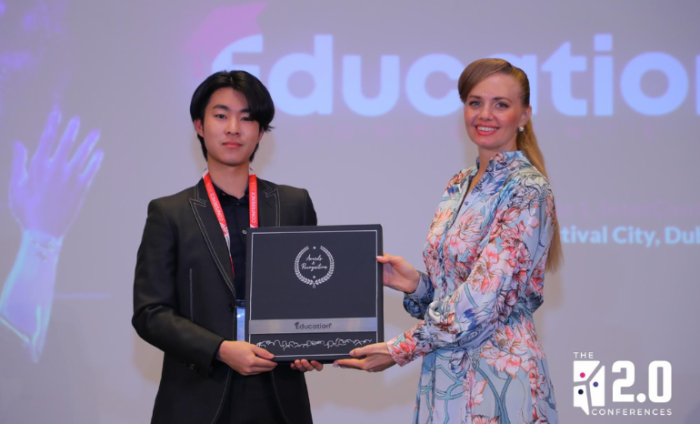 Kaito Mizukoshi accepts the Young Leadership Award at the Education 2.0 Conference in Dubai