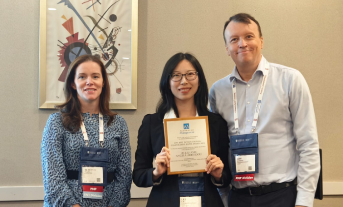 Image: Lei Liu (centre) accepts Best Paper Award from Academy of Management members and Professors Rebecca Tekula (left) and Gary Schwarz (right).