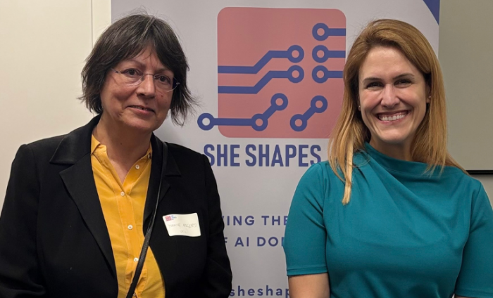 She Shapes AI is a platform and community that aims to diversify the conversations surrounding the implementation, use and governance of artificial intelligence and showcase the voices and contributions of women in this space. The event also saw opening remarks from Yvonne Rogers (pictured left), Professor within UCL’s Faculty of Engineering and Director of the Interaction Centre at UCL (UCLIC). A trailblazer in her own right, Yvonne received an MRC Suffrage and Science Award in 2020, solidifying her position as one of the UK’s leading women in mathematics and computing. Yvonne’s remarks highlighted the strong metaphor of the ‘side door’ – the notion that women may not be invited in through the front door, but nevertheless significantly impact human-centred applications of AI in ways that benefit society.