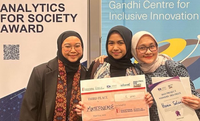 Finally, third place was awarded to UCL School of Management and University College London students Rania Azzahra, Hanin Fairuz Salsabila and Oktaviani Saputri for MaternEASE. MaternEASE is a smart ring that tracks maternal health to detect early pregnancy risks. The tool combines real-time vital sign monitoring with AI-driven risk prediction to ensure complications are identified and managed efficiently, hoping to save lives before it’s too late.
