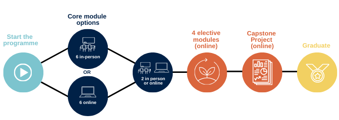 Make the most of a hybrid approach to studying, with the option to study everything online, or take the core modules in-person.
