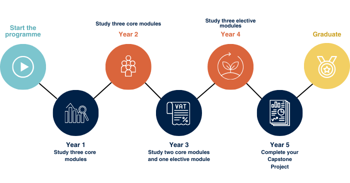 This plan gives you more time between classes, allowing you to study for two or three terms per-year. In this plan, you could study three core modules in year one and two, two elective modules in year three and four, and finish with your capstone project in year five.